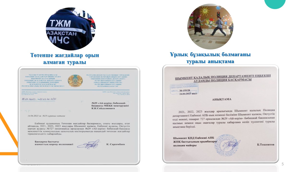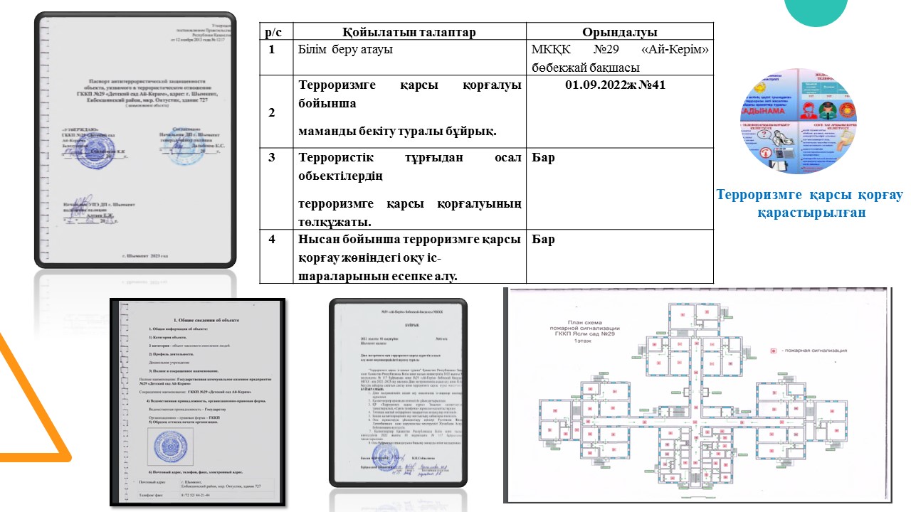 - Мектепке дейінгі балалардың жас ерекшеліктеріне сай өртке қарсы, санитариялық, техникалық нормалар мен ережелердің сақталуы бақшадағы қауіпсіз жағдайлардың кепілі болып табылады. Білім беру процесіне қатысушылардың қауіпсіздігін қамтамасыз ету туралы ережені қамтитын негізгі нормативтік құқықтық акт «Білім беру туралы» ҚР Заңы болып табылады.