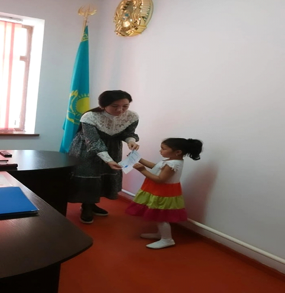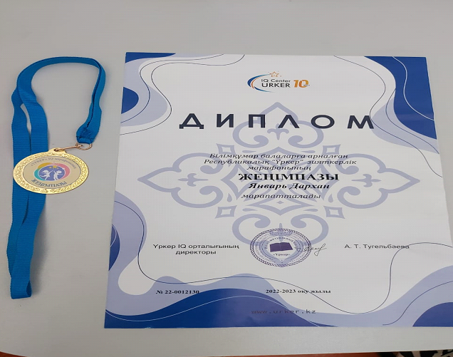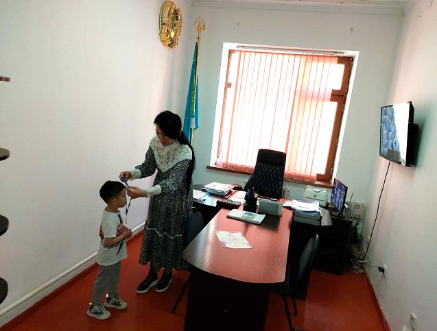 Халықаралық Үркер зияткерлік марафонының жеңімпазы Ақкөгершін тобының бүлдіршіні Январь Дарханды медальмен марапаттау сәтінен