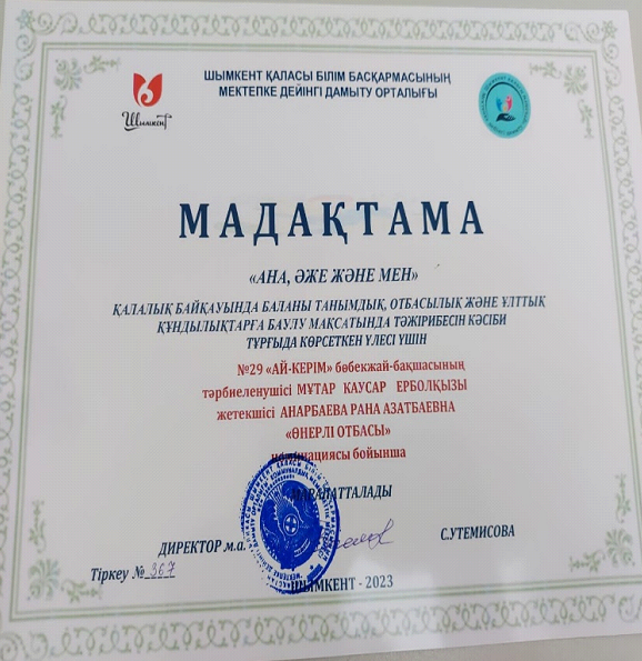 Шымкент қаласы білім басқармасының Мектепке дейінгі дамыту орталығының ұйымдастыруымен «Ана, әже және мен» қалалық байқауда бақшамыздың тәрбиеленушісі Мұхтар Кәусар тәрбиеші апайы Анарбаева Рана Азатбайқызы екеуі тәжірбиесін кәсіби түрде жеткізгені үшін «Өнерлі отбасы» номинациясы бойынша марапатталды.